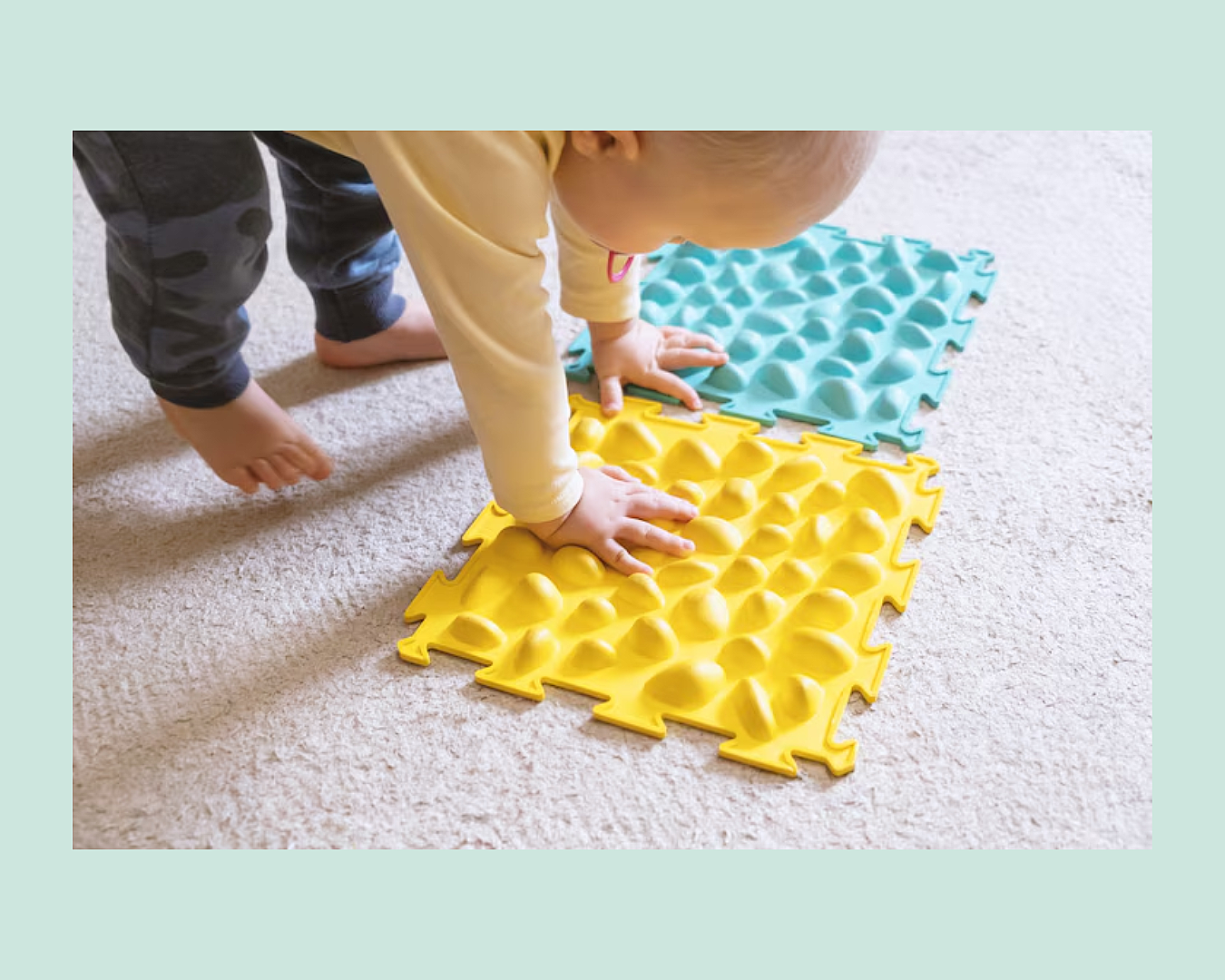 - Классики по ортопедическим коврикам. Ребенку даем словесное указание — прыгать ноги вместе, ноги врозь. Если малыш не умеет прыгать, то можно шагать и расставлять ноги широко/узко. Ещё можно попросить малыша наступать на коврик определённого цвета;