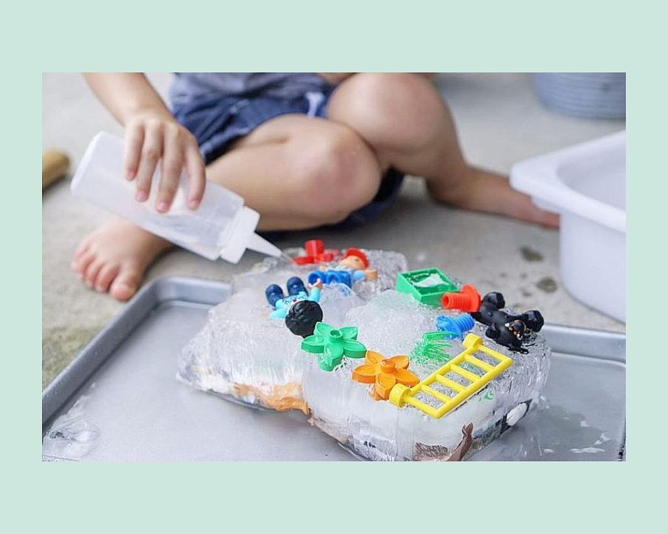 - Разморозка. Чтобы что-то разморозить, надо что-то заранее заморозить. Замораживать будем небольшие игрушки (желательно те, которые ребёнок давно не видел) в большом контейнере с водой. Чтобы игрушки не всплывали, замораживать лучше «слоями». Тёплую воду наливаем в стаканчик и потихоньку размораживаем. Ещё вариант – использовать воздушный шар. Положить в шар игрушку, налить воды, завязать, засунуть в морозилку. Через несколько часов получится ледяное яйцо. Замороженный шар достаём, ребёнку выдаём тазик или поднос, ложку и стакан с тёплой водой, пусть размораживает. Еще вариант – дать небольшой детский молоточек.
