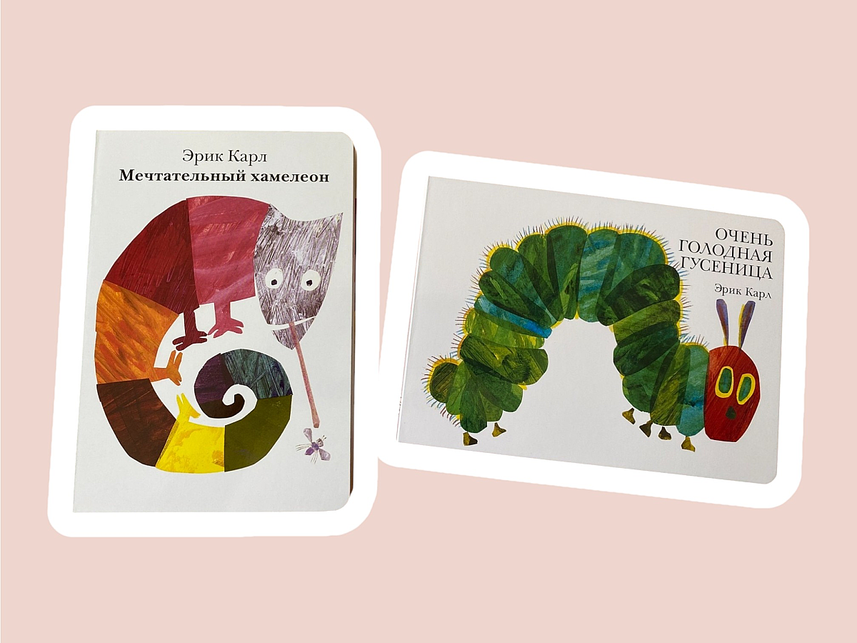 Эрик Карл с его «Очень голодной гусеницей» — история безусловного успеха среди книжек—картонок. На протяжении примерно тридцати страниц действительно очень голодная гусеница ест все на своем пути к превращению в бабочку и оставляет крошечные дырочки, так хорошо подходящие для детских пальцев. Другие хиты Карла — «Мечтательный Хамелеон» и «От головы до ног».