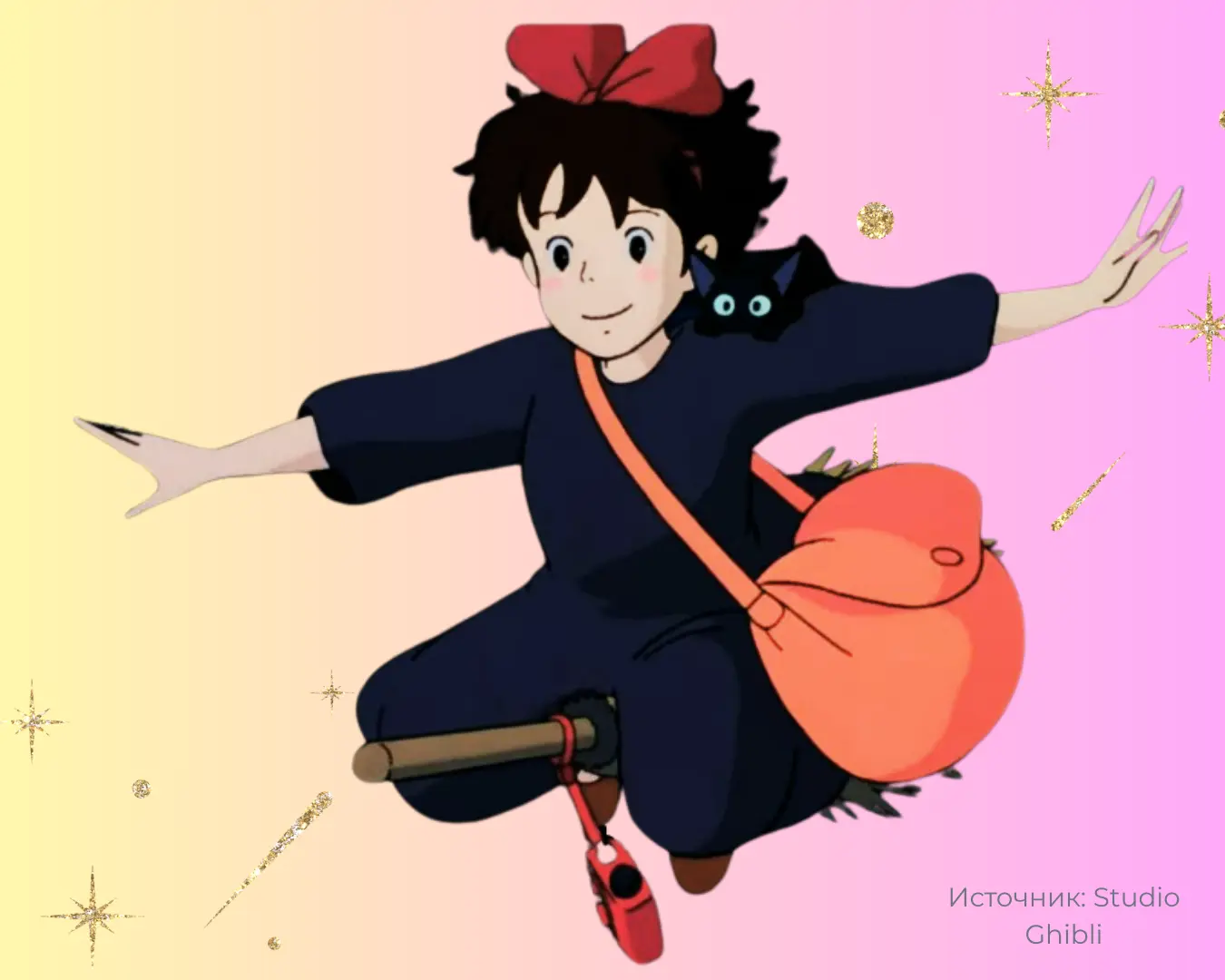 Аниме студии «Гибли» по одноимённой детской книге. Главная героиня — 13-летняя Кики — уезжает от родителей в чужой город и учится жить самостоятельно. Ей нужно продержаться так целый год, обеспечивая себя и своего верного спутника — говорящего кота Зизи. Освоившись, Кики открывает собственную волшебную службу доставки по воздуху. Она находит новых друзей, а постепенно и своё место в мире.