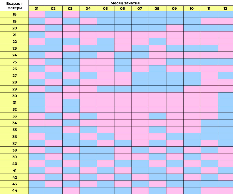 Нужно всего лишь знать возраст беременной женщины, месяц зачатия ребёнка и найти на таблице клеточку на их пересечении. Готово! Обратите внимание, что если вы хотите мальчика, то двадцать один год — это не лучший возраст.
