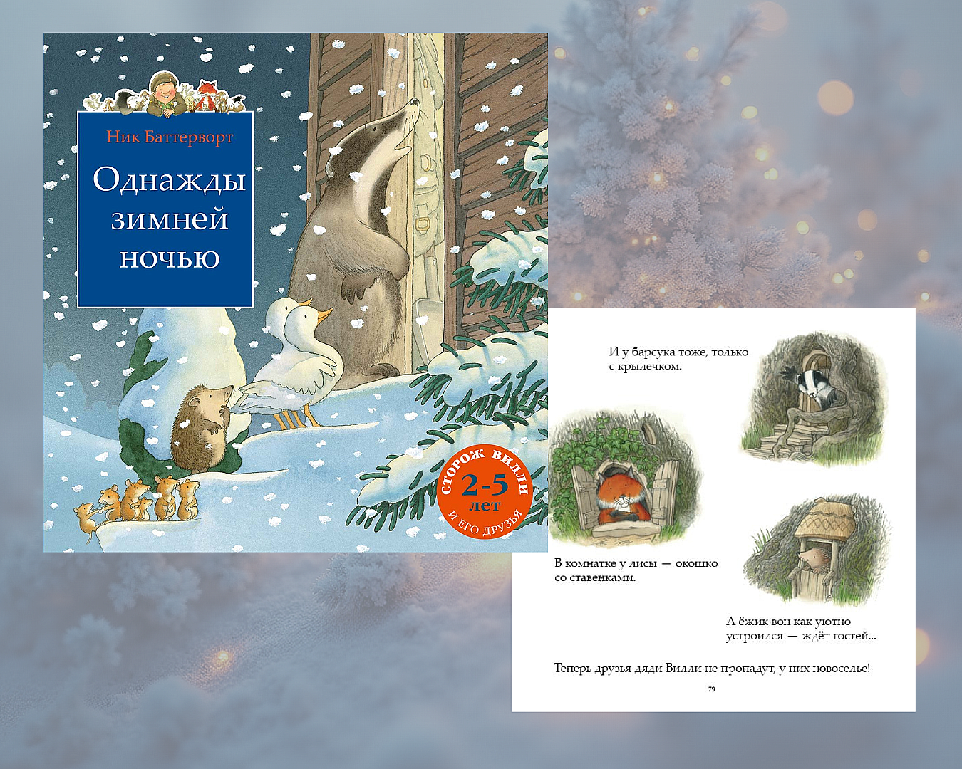 «Однажды зимней ночью” – сборник, объединяющий три истории о стороже Вилли, который работает в старом парке. Он дружит с обидающими там зверями и птицами, зимой отогревает в своей сторожке, летом – спасает от наводнений. Они в свою очередь – готовы в любой момент прийти на выручку.