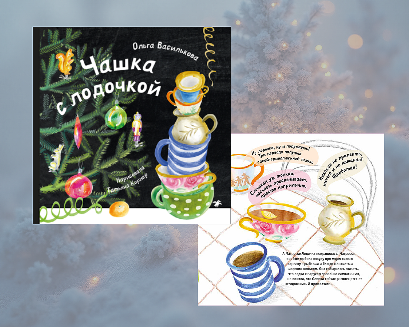 «Чашка с лодочкой” — трогательная и нежная сказка от издательства «Белая ворона». Там рассказывают: «писательница Ольа Василькова в своих книгах много работает с темами непохожести, отличий, сложности общения, принятия себя и другого». Эта история – про чашку с блошиного рынка, которая никак не может найти общий язык с другими чашками.