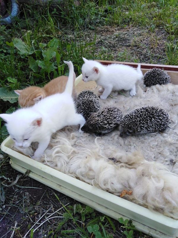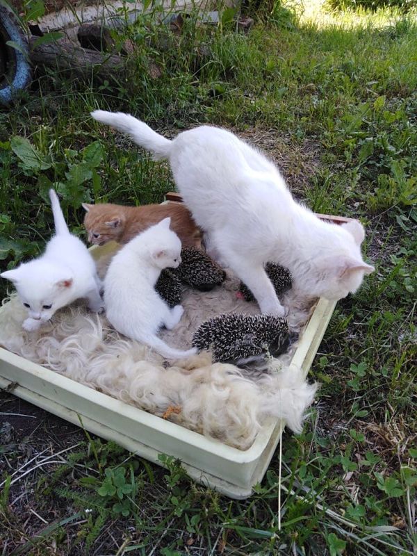 Ежиха привела на дачный участок ежат и умерла. Заботу о малышах взяла на себя кошка, которая недавно окотилась. Теперь кошка ухаживает не только за своими котятами, но и за сиротками-ёжиками.
