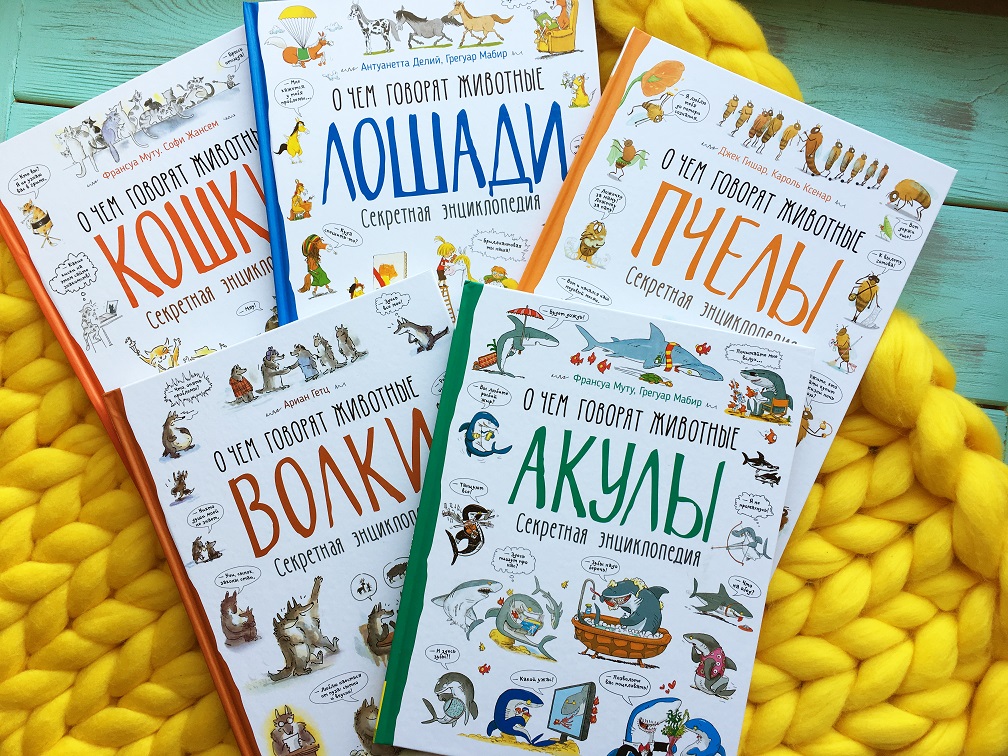 Из небольшой серии книг «О чем говорят животные. Секретная энциклопедия», вышедшей в издательстве «РОСМЭН», можно узнать много интересных фактов о лошадях, волках, кошках, акулах и пчелах. Непосвященному человеку трудно даже представить, насколько они «разговорчивы»! Художники-иллюстраторы этих книг смогли показать их диалоги друг с другом и с окружающим миром при помощи забавных комиксов, где каждый герой наделен своим характером.