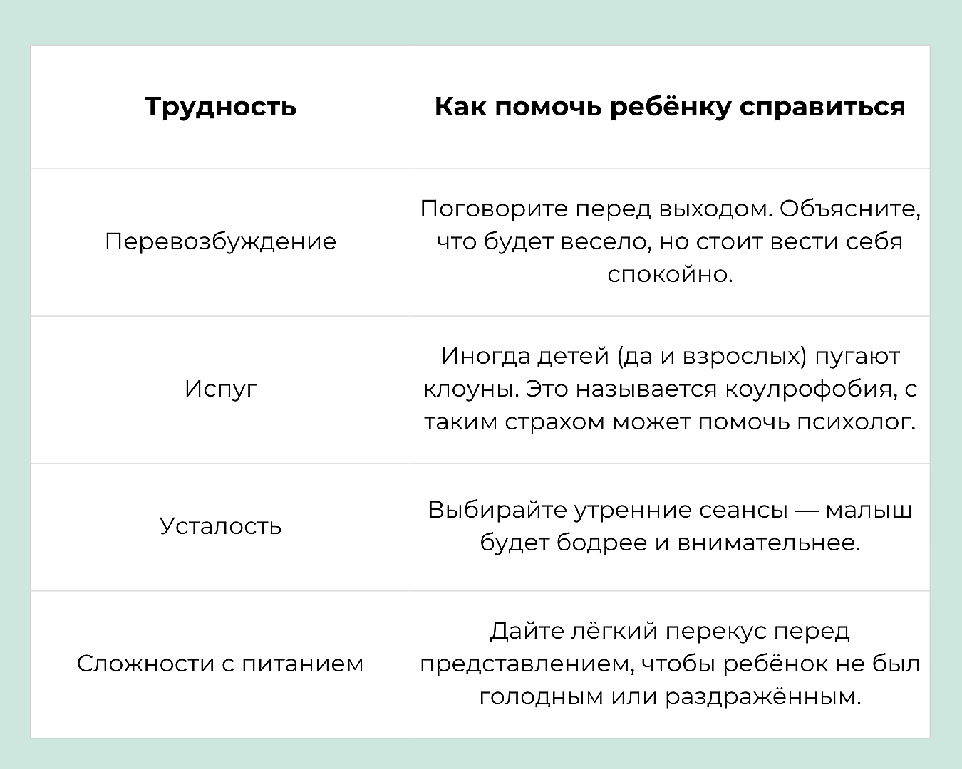 В день икс не нагружайте ребёнка дополнительными занятиями: пусть всё будет как обычно. А отправляясь в цирк, возьмите с собой воду и любимую игрушку (чтобы успокоить ребёнка, если понадобится).