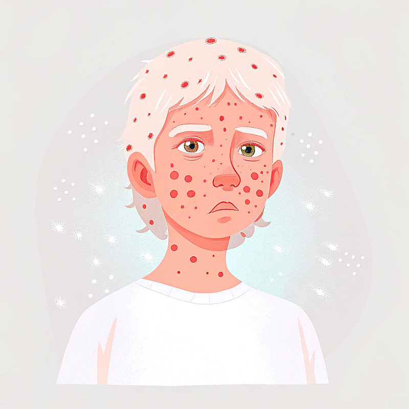 Инкубационный период ветряной оспы — от 10 до 21 дня (8). Первые признаки (7) часто напоминают легкую простуду: слабость, небольшое повышение температуры, головная или мышечная боль. После репликации VZV разносится по крови: появляется характерная сыпь — сначала небольшие красные пятна, которые быстро превращаются в зудящие пузырьки, наполненные прозрачной жидкостью. Высыпания распространяются по всему телу, включая лицо, волосистую часть головы и слизистые оболочки. Через несколько дней пузырьки лопаются, образуя корочки, которые постепенно отпадают. Новые высыпания могут появляться в течение нескольких дней, поэтому на теле одновременно сыпь может быть на разных стадиях развития. При правильном уходе везикулы обычно подсыхают к шестому дню. Корочки отпадают примерно через 1–2 недели, оставляя временную незначительную пигментацию кожи.